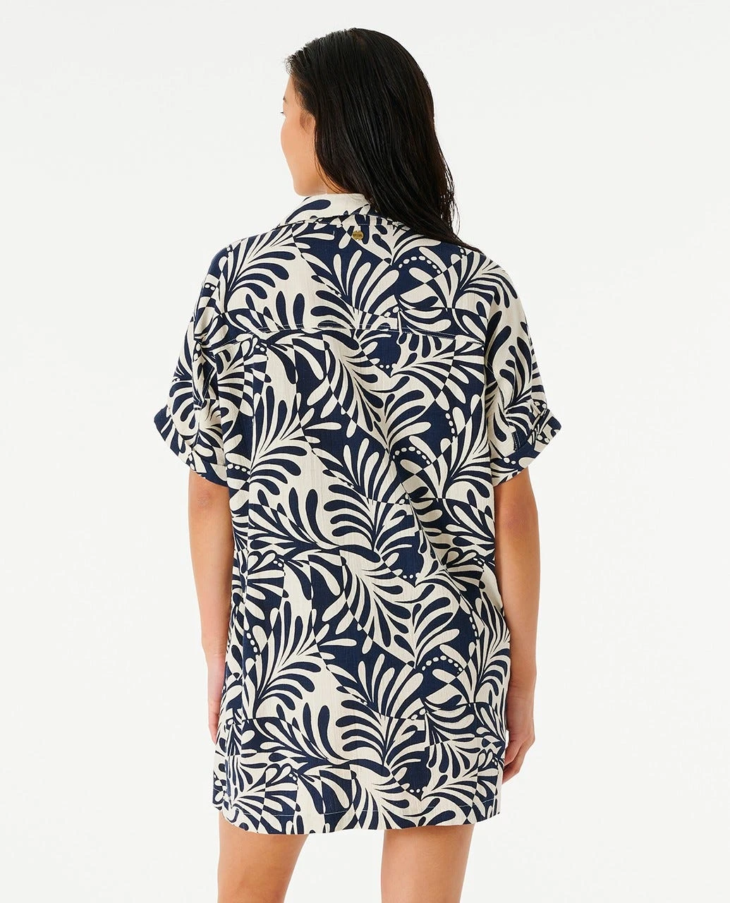 The Afterglow Shirt is a wild button through collared dress, featuring the collections signature swirl design, rolled sleeves, side pockets, and a comfy linen composition.