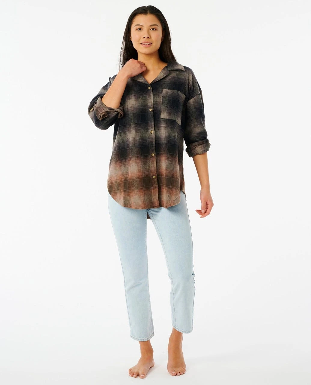 The Berkley Flannel is a super relaxed beach shirt, featuring button up collared design, classic plaid pattern, and scalloped hem with subtle colour gradient fade.