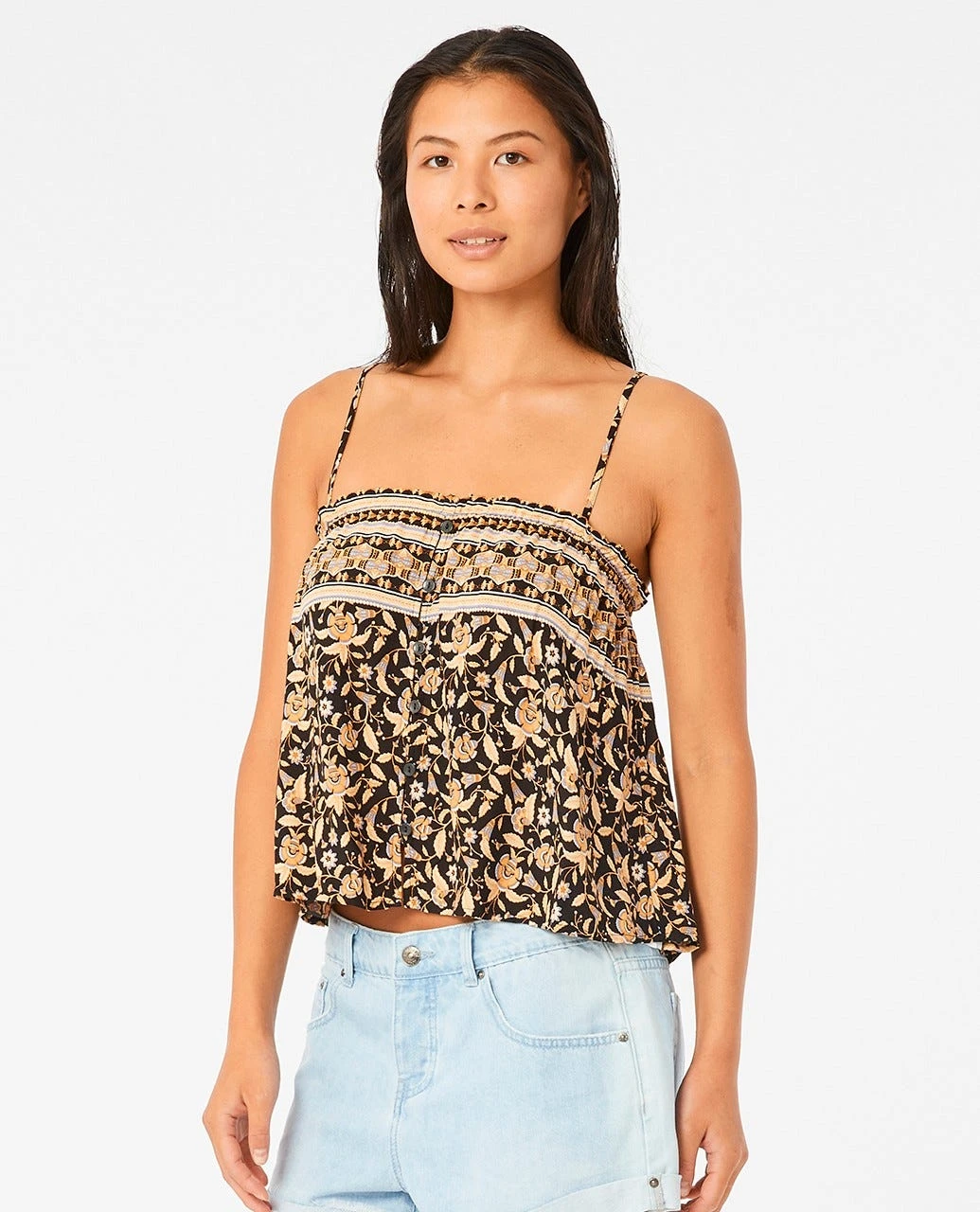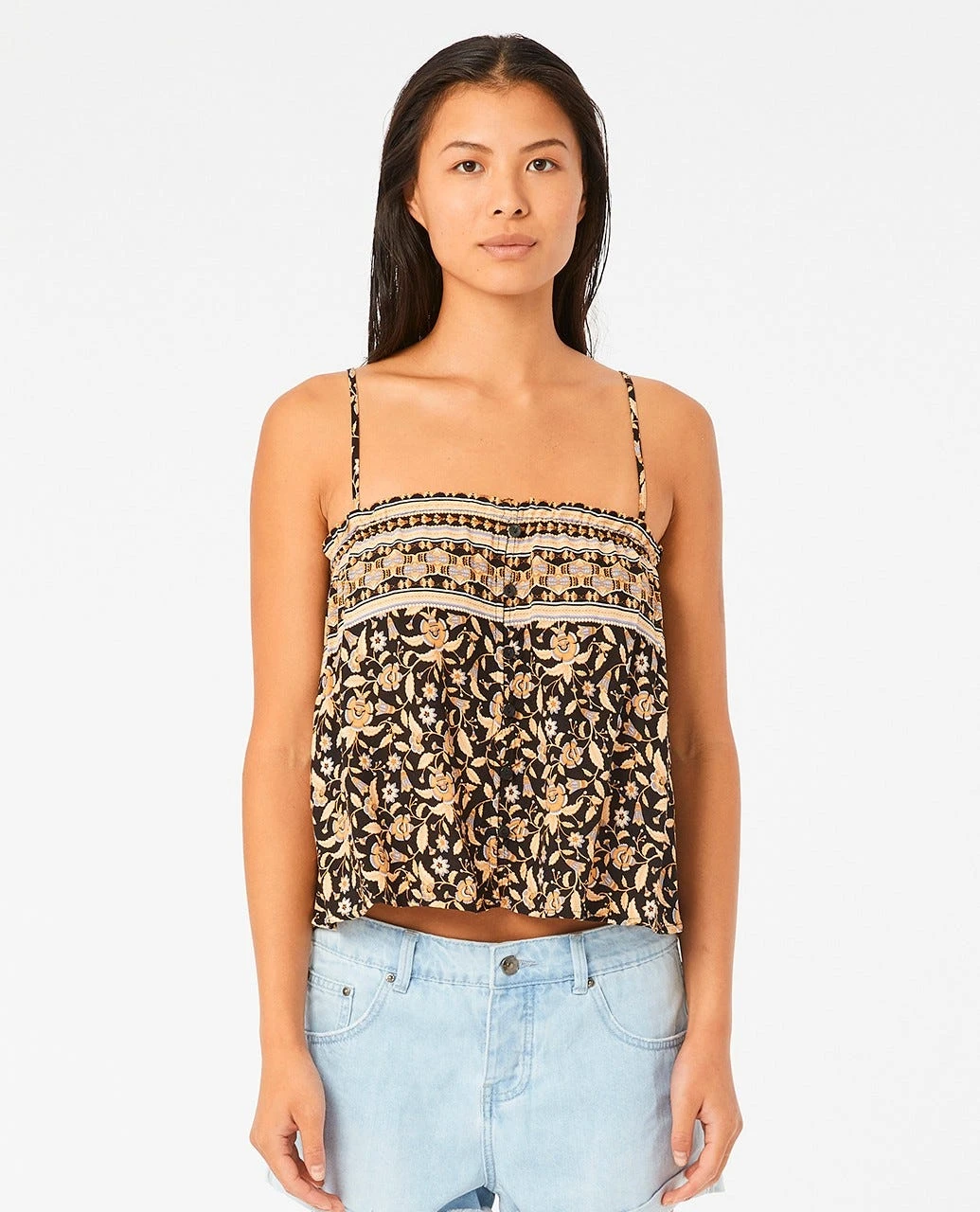 The Dreamer Cami is a great women’s summer top made with sustainability in mind from EcoVero fabric with solution dyed yarn. Featuring adjustable straps, button through design, and cute all over yardage print.