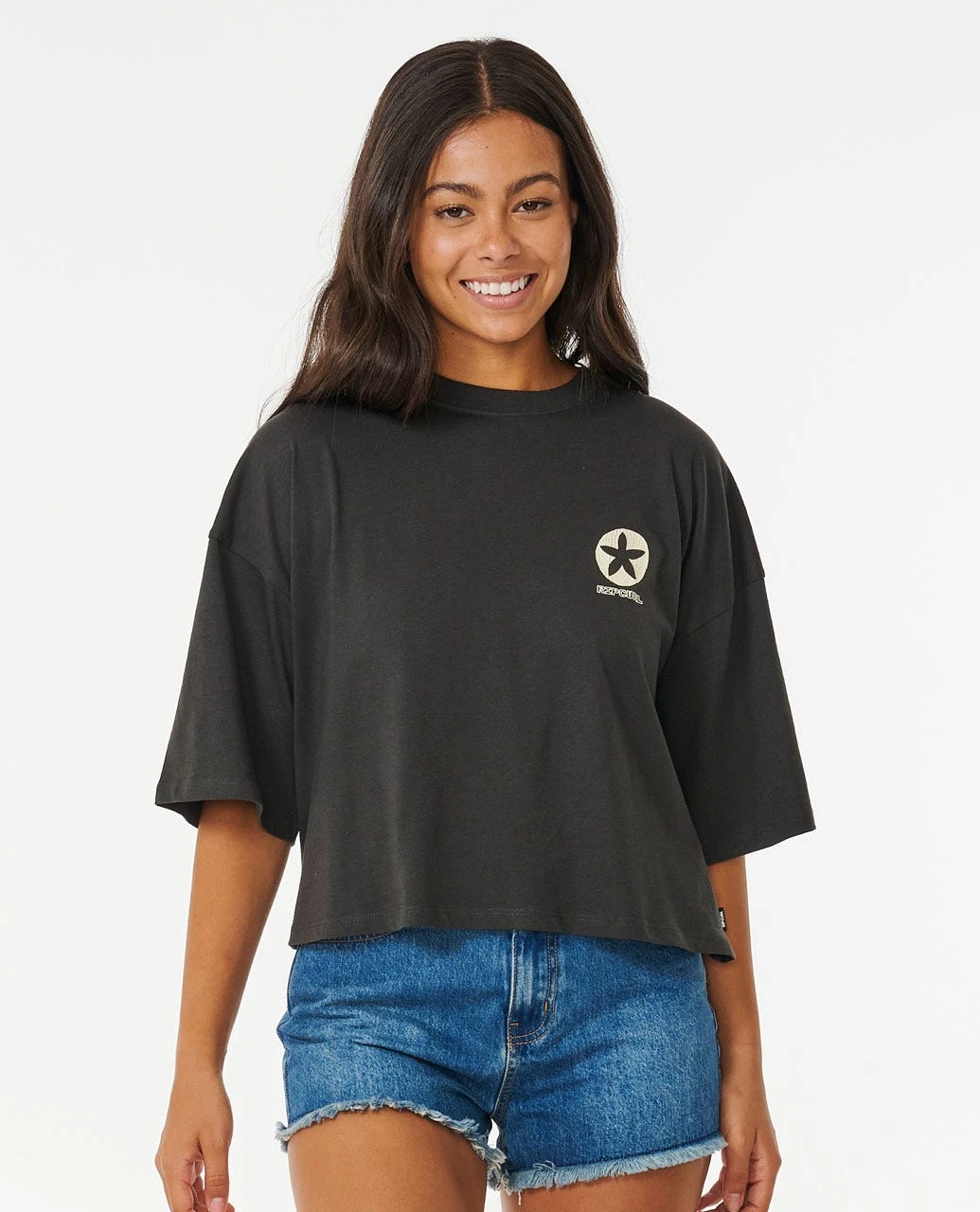 The Flourish Heritage Crop Tee combines style and comfort. It features front and back prints that add a trendy touch. The inner neck print and woven flag label offer unique details. Enjoy your casual days with confidence and fashion in this heritage crop tee.