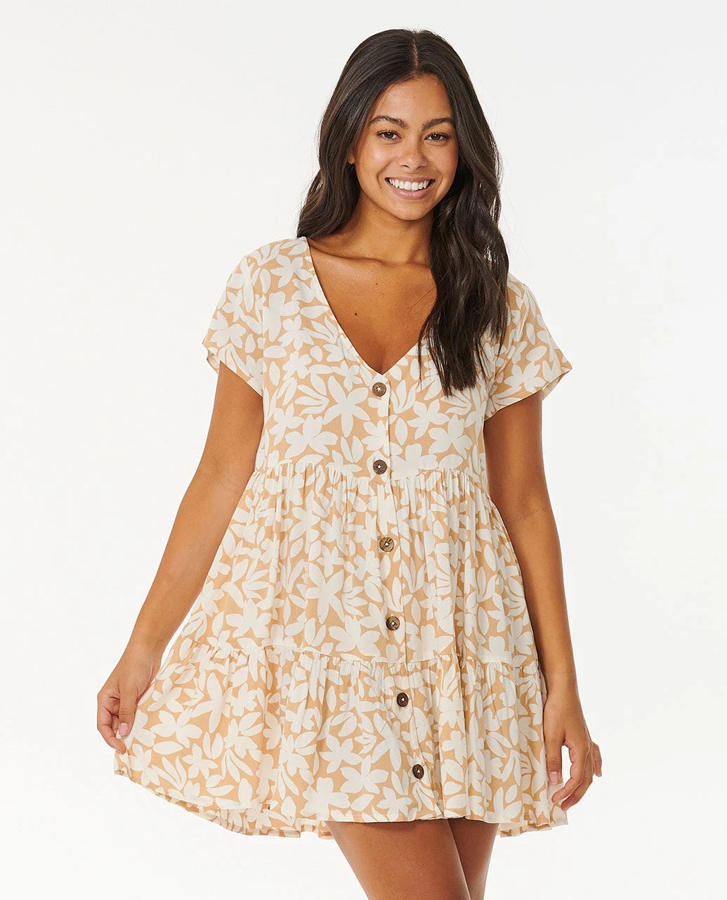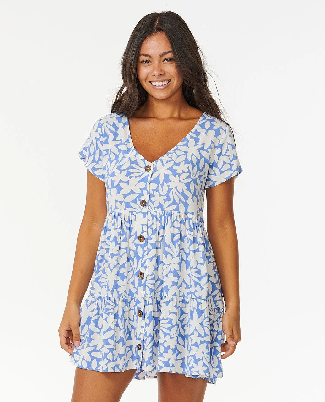 The Holiday Tropics Dress is a perfect addition to your summer wardrobe. It features an all-over yardage print that adds a fashionable touch. The metal logo trim and button-through design add stylish details. The coconut buttons enhance the tropical vibe of the dress. Embrace the summer season with confidence and style in this Holiday Tropics Dress.