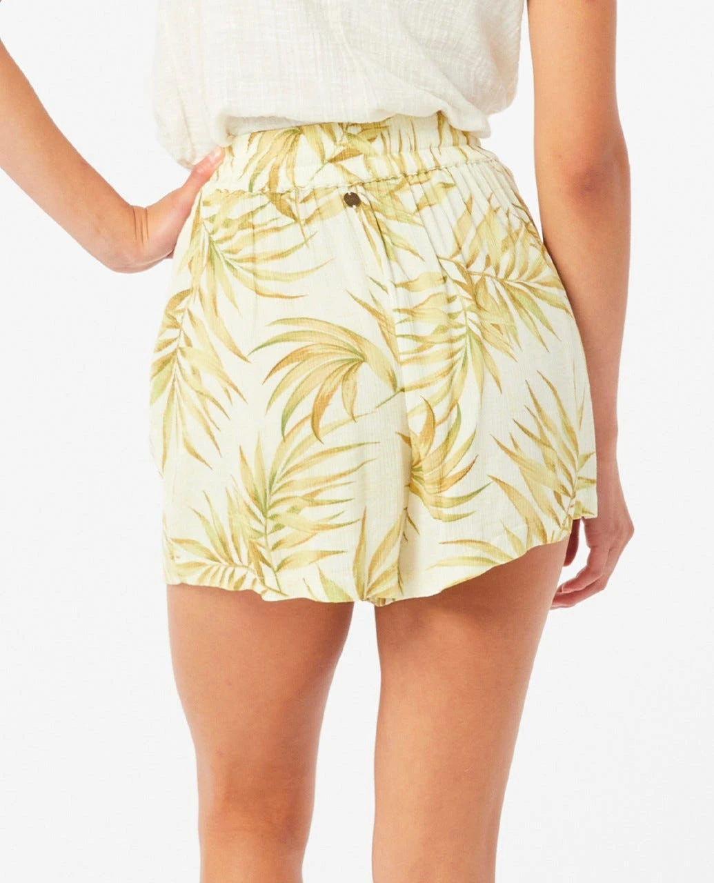 The Montego Palm Short is a great women’s summer style. Made from EcoVero fabric with solution dyed yarn. Featuring elastic waistband, functional front tie, all over yardage print, and a relaxed fit, it’s perfect for dressy occasions or rockpool rambling barefoot at the beach.