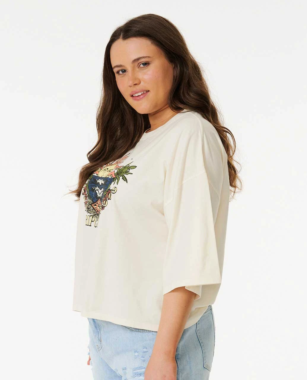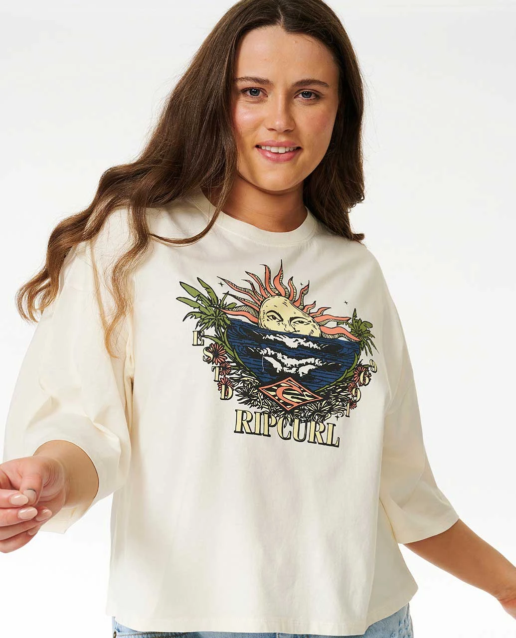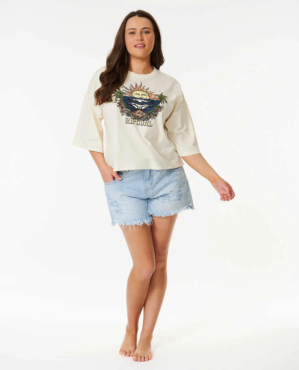 Embrace a vintage-inspired look with the Shore Break Heritage Crop Tee. Made from cotton jersey, this heritage fit tee features a garment pigment dye with a heavy enzyme wash for a worn-in and authentic feel. The front print adds a touch of nostalgia, while the crop length adds a modern twist. Pair it with your favorite high-waisted bottoms for a trendy and comfortable ensemble.