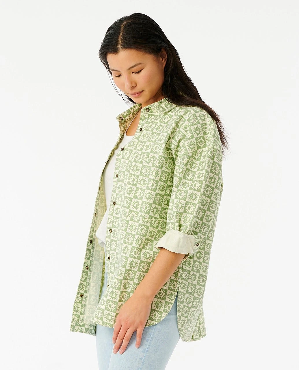 Stay stylish and cozy with the Sunburst Shacket. Made from a soft cotton twill peached material, this shacket is a stylish layer piece that is super versatile. The heavy stone wash gives it a rugged, vintage look, and the oversized fit provides a comfortable, relaxed feel. The front pocket and all-over yardage print with checkered surf and sun icons add a playful touch, while the metal snap buttons provide a secure closure. So whether you’re running errands or throwing it on for a night out, the Sunburst Shacket is the perfect addition to your wardrobe.