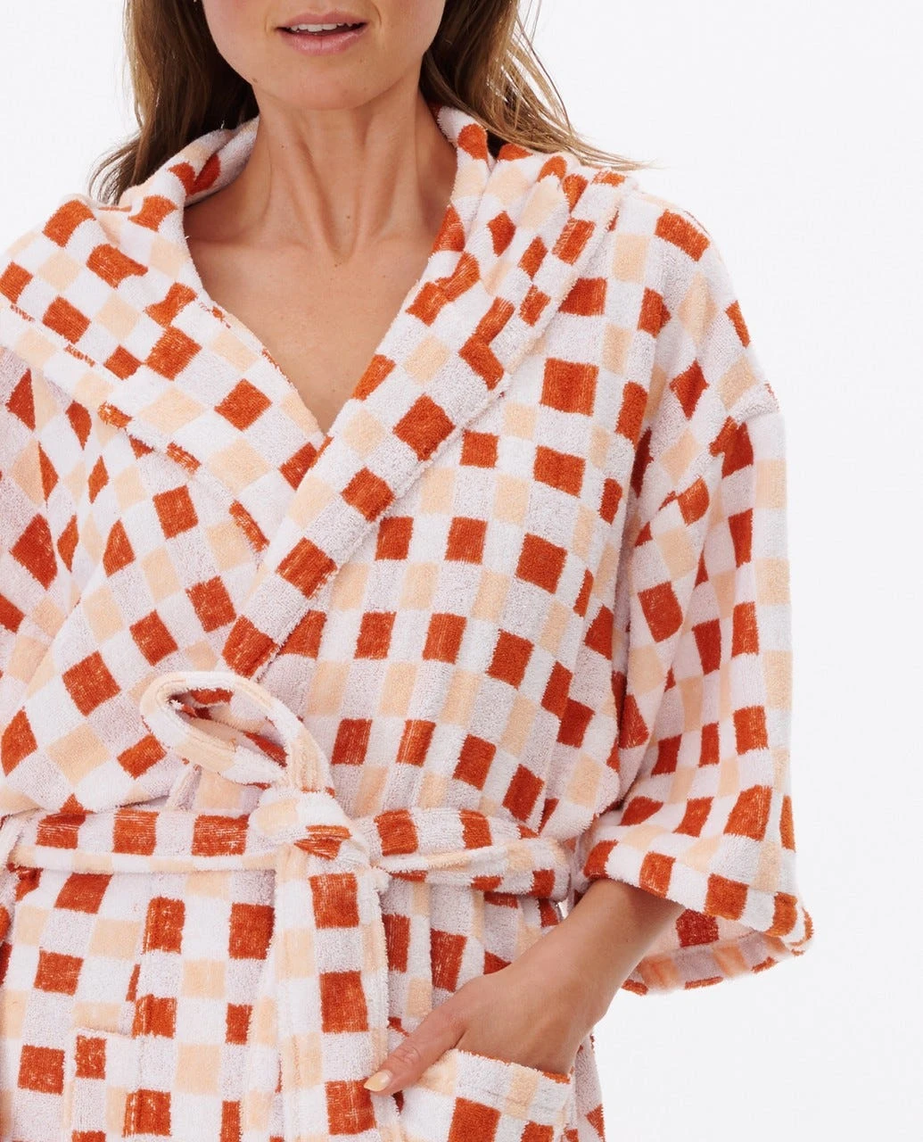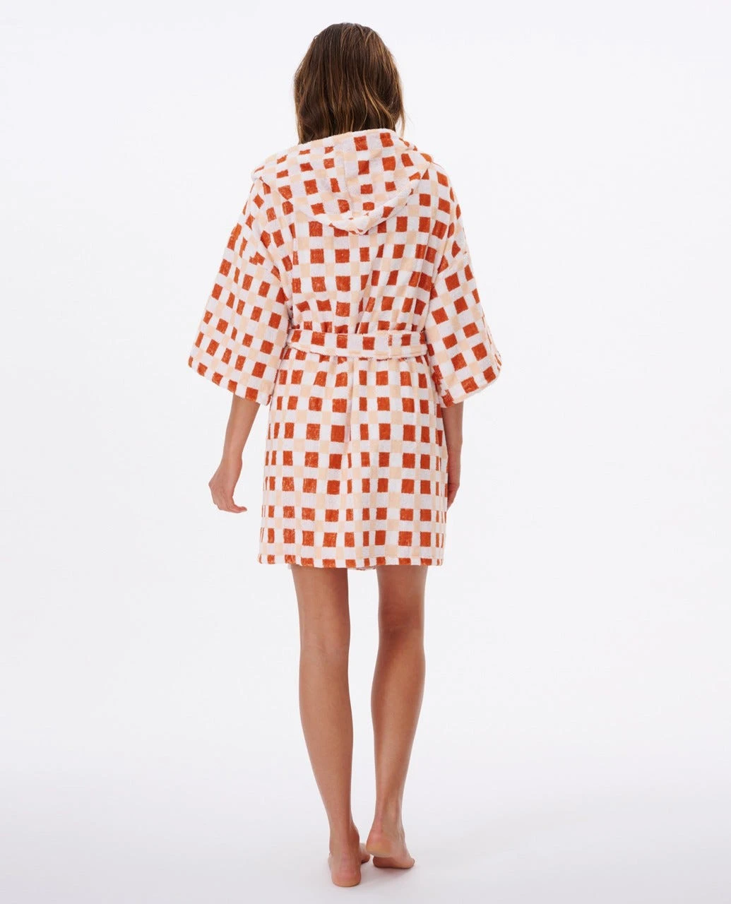 The Surf Check Robe is a stylish spin on the classic hooded towel. Made from lush terry fabric, in a relaxed fit reminiscent of day spa bathrobes featuring self fabric adjustable drawcord, hood and front patch pockets. Designed in Rip Curl’s signature surf check pattern with fancy weave.